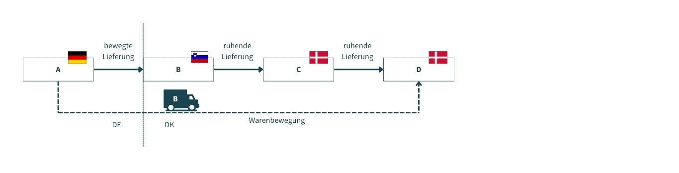 Dem Urteil vom 03.12.2025, das ein slowenisches Verfahren betraf, lag ein Reihengeschäft zugrunde, das sich vom üblichen Dreiecksgeschäft unterschied. Es waren nicht nur drei, sondern vier Unternehmer beteiligt. Ein deutscher Unternehmer (A) lieferte Waren an einen in Slowenien registrierten Unternehmer (B), der die Waren an einen Unternehmer mit dänischer USt‑IdNr. (C) weiterlieferte. Dieser wiederum trat als Lieferer gegenüber einem weiteren dänischen Unternehmer (D) auf. Die Beförderung der Ware erfolgte unmittelbar von Deutschland nach Dänemark und wurde durch den slowenischen Zwischenhändler B organisiert.